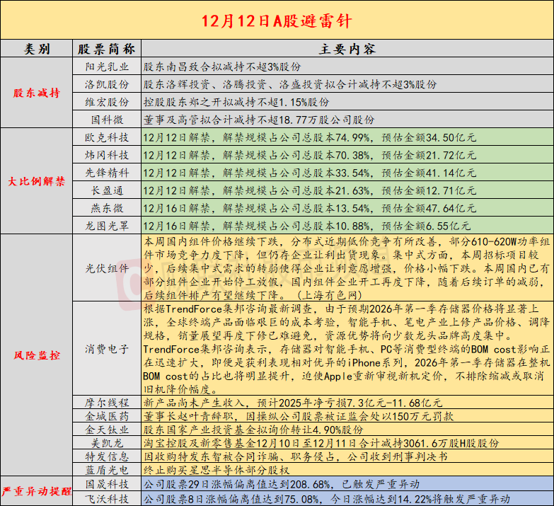 导读:财联社12月12日投资避雷针,近日,A股及国外市集潜在风险事件如下。国内经济信息方面包括:1)国内商品期市夜盘收盘大批下落,动力品跌幅居前;2)本周国内组件价钱不竭下落,后续排产或不竭下降;公司方面重心珍惜包括:1)指示风险,新产物尚未产生收入,辩论2025年净亏本7.3亿元-11.68亿元;2)金城医药董事长去职,因主宰公司股票被证监会处以150万元罚金;国外市集重心珍惜包括:1)好意思股三大指数收盘涨跌不一,大型科技股大批下落;2)欧盟拟推迟燃油新车禁售令五年。 经济信息 1、国内商品期市夜盘收盘大批下落,动力品跌幅居前,LPG跌3.66%;玄色系一谈下落,焦煤跌3.39%;化工品一谈下落,沥青跌2.29%;非金属建材一谈下落,PVC跌1.51%;农副产物大批下落,棉花跌0.22%;油脂油料涨幅居前,菜油涨1.11%。 2、据中指院本日发布的2026中国房地产市集趋势敷陈,中特性形下,辩论2026年寰宇新建商品房销售面积同比下降6.2%,降幅较本年有所收窄,市集分化态势延续。在控增量、优存量计谋导向下,辩论2026年新开工面积下降8.6%,降幅较畴前几年主见收窄;辩论房地产投资同比下降11%,而供给端缩量将有助于市集库存下降,推动供求相干改善。中永远来看,“十五五”新建商品住宅年均销售面积辩论保抓在7-8亿平米操纵,跟着市集库存渐渐回落,合作社会预期建造,辩论“十五五”中后期房地产市集有望渐渐走出退换阶段。(财联社记者 李洁) 3、本周国内组件价钱不竭下落,漫步式近期廉价竞争有所改善,部分610-620W功率组件市集竞争力度下降,但仍存企业让利出货时势。汇注式方面,本周招标气象较少,后续汇注式需求的转弱使得企业让利意愿增强,价钱小幅下落。本周国内已有部分组件企业初始停工休假,国内组件企业开工再度下降,跟着后续订单的削弱,后续组件排产有望不竭下降。 (上海有色网) 公司预警 1、摩尔线程:新产物尚未产生收入,辩论2025年净亏本7.3亿元-11.68亿元。 2、金城医药:董事长赵叶青去职,因主宰公司股票被证监会处以150万元罚金。 3、阳光乳业:推动南昌致合拟减抓不超3%股份。 4、洛凯股份:推动洛辉投资、洛腾投资、洛盛投资拟共计减抓不超3%股份。 5、维宏股份:控股推动郑之开拟减抓不超1.15%股份。 6、国科微:董事及高管拟共计减抓不超18.77万股公司股份。 7、金天钛业:推动国度产业投资基金拟询价转让4.90%股份。 8、好意思凯龙:淘宝控股及新零卖基金12月10日至12月11日共计减抓3061.6万股H股股份。 9、特发信息:因收购特发东智被公约应用、职务侵占,公司收到刑事判决书。 10、蓝盾光电:圮绝购买星念念半导体部分股权。 国外预警 1、好意思股三大指数收盘涨跌不一,谈指涨1.34%,纳指跌0.25%,标普500指数涨0.21%,大型科技股大批下落,甲骨文跌超10%,谷歌跌超2%,特斯拉、英伟达跌超1%。贵金属、金属原材料大涨,Vista黄金涨超15%,赫克拉矿业涨超12%,世纪铝业涨超6%。加密货币、半导体板块走低,Robinhood跌超9%,Arm、英特尔跌超3%,Coinbase跌超2%。 2、WTI原油期货价钱收跌1.47%,报57.60好意思元/桶。布伦特原油期货收跌1.49%,报61.28好意思元/桶。 3、欧盟正计议将原定于2035年全面禁售内燃机新车的缱绻推迟五年,此举是在德国、意大利等主要汽车制造国热烈游说下作出的退换。据知情东谈主士表现,欧盟委员会将于下周公布对汽车行业脱碳礼貌的调动决策。多国政府和车企以为,刻下向纯电动车转型的要领过于激进,可能危及欧洲这一中枢产业的糊口。新决策拟允许插电式混动车和增程式电动车在2035年后不竭销售最多五年,但前提是这些车辆必须使用先进生物燃料或“电子燃料”(由拿获的二氧化碳与可再生电力合成)并在制造进程中给与绿色钢材。 4、把柄TrendForce集邦商讨最新走访,由于预期2026年第一季存储器价钱将权臣高涨,大家末端产物靠近难题的本钱测验,智高东谈主机、笔电产业上修产物价钱、调降规格,销量辩论再度下修已难幸免,资源上风将向少数龙头品牌高度汇注。TrendForce集邦商讨暗示,存储器对智高东谈主机、PC等消耗型末端的BOM cost影响正在连忙扩大,即即是赚钱发达相对优异的iPhone系列,2026年第一季存储器在整机BOM cost的占比也将主见擢升,迫使Apple再行注目新机订价,不排斥缩减或取消旧机降价幅度。